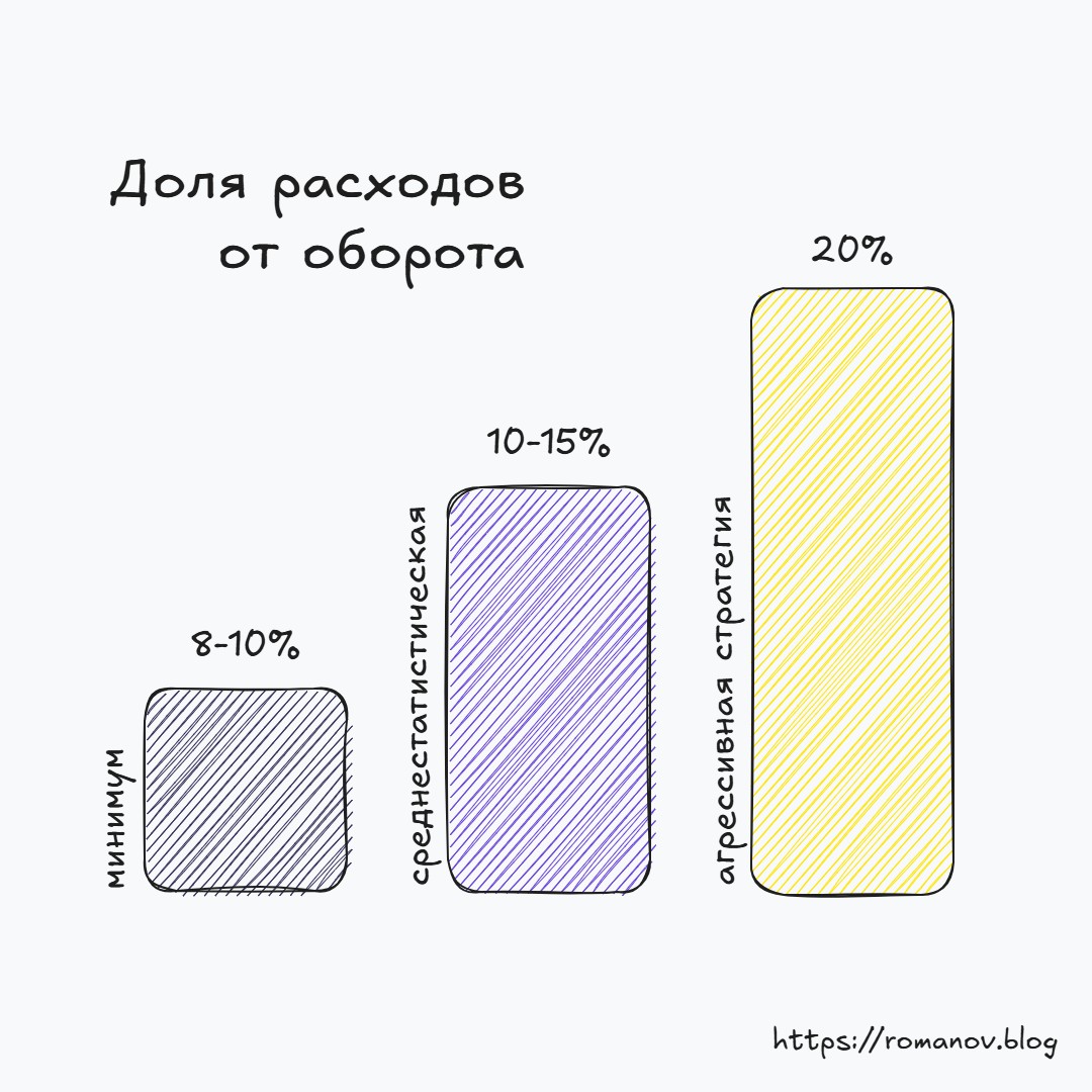 - 8-10% от оборота (иногда прибыли) - это минимум, когда компания получит приемлимые результаты.